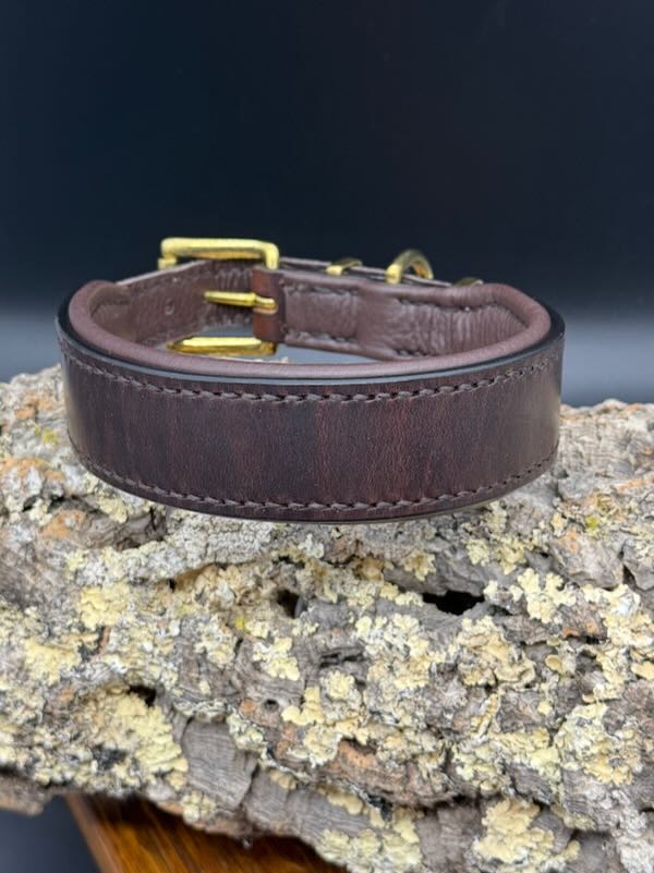 Die Innenseite des dunkelbraunen Halsbands ist mit weichem Nappaleder gepolstert. Diese sorgt dafür, dass Druckstellen reduziert werden und das Halsband auch bei längeren Spaziergängen angenehm zu tragen ist.