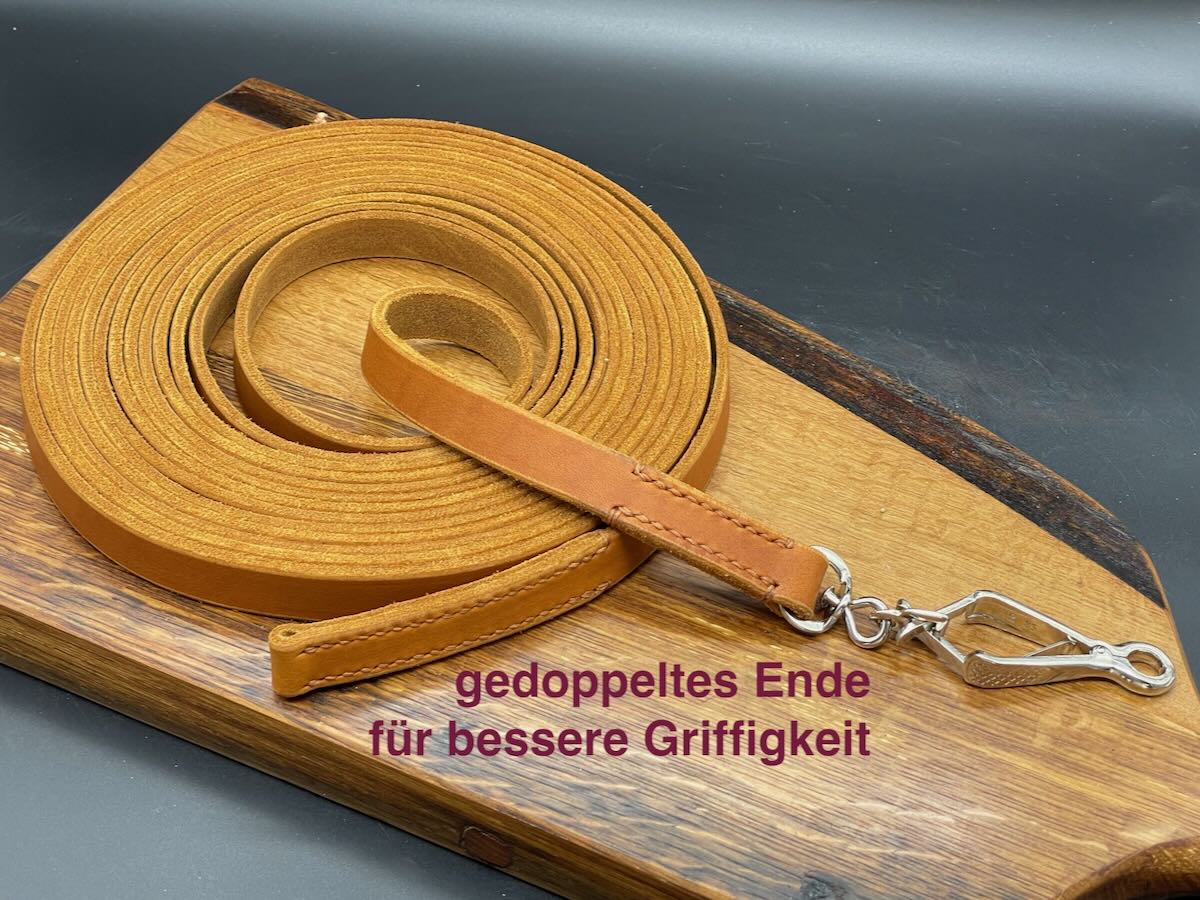 Für alle, die das Besondere suchen: Die Schleppleine „Trail“ ist auch in einer besonders hochwertigen Ausführung mit Adaptern aus pflanzlich gegerbtem Geschirrleder erhältlich. Diese Variante vereint Handwerkskunst, Funktion und Ästhetik auf höchstem Niveau.
