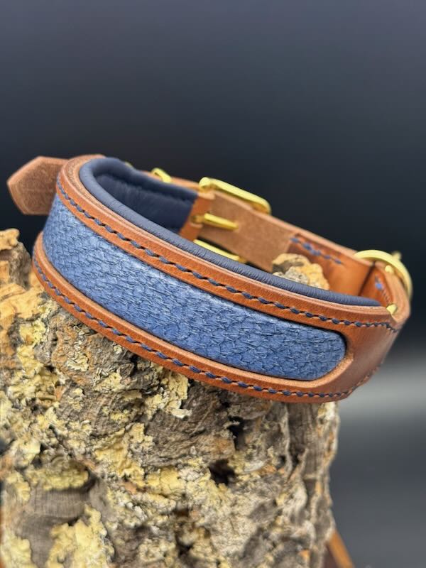 Das Zugstopp Halsband „Royal Ocean Breeze“ verbindet die natürliche Ausstrahlung von ungefärbtem Geschirrleder mit den kühlen, lebendigen Blautönen des Lachsleders. Inspiriert von Meer und Wind entsteht ein Design, das Ruhe, Tiefe und Eleganz vereint.